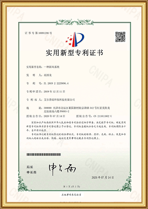 實(shí)用新型專利證書(一種新風(fēng)系統(tǒng))