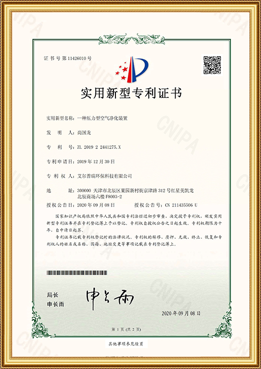 實(shí)用新型專利證書(一種空氣凈化產(chǎn)品生產(chǎn)裝置